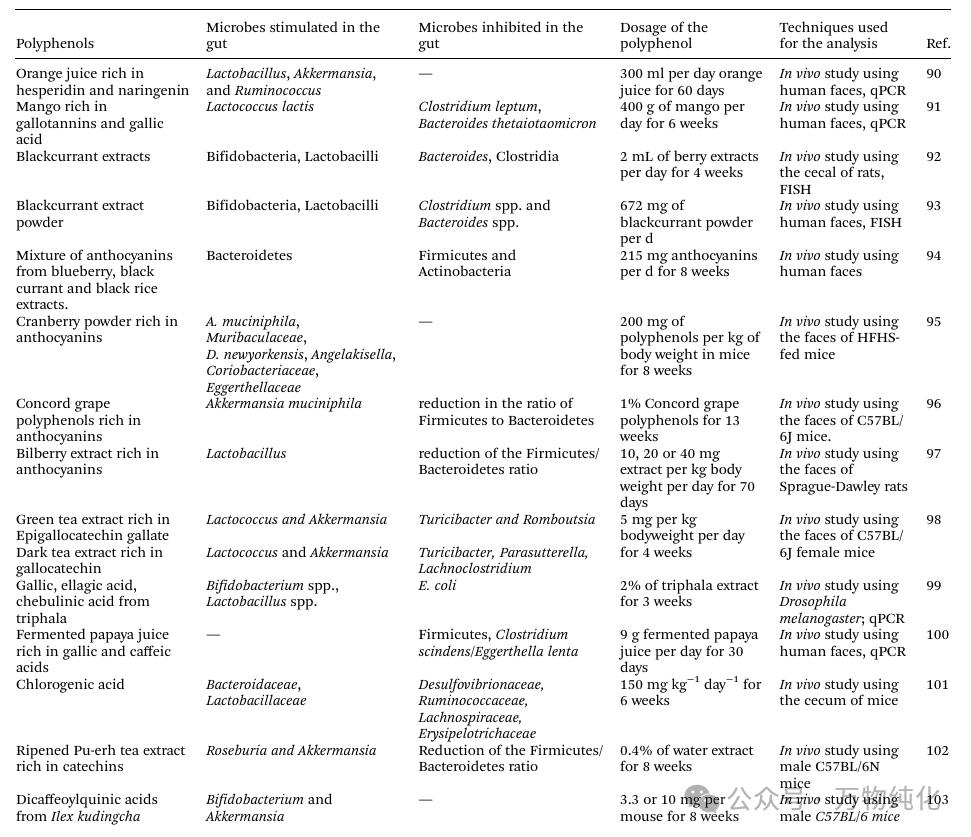 [表1总结了橙汁、芒果、黑加仑、蔓越莓、绿茶等多种植物提取物的体内研究,证明其对特定有益菌(如Akkermansia, Lactobacillus)的促进作用和对有害菌(如Clostridium)的抑制作用。]